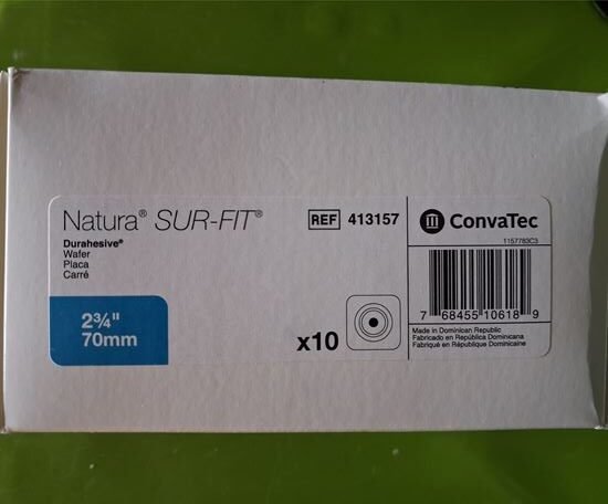 413157 SUR-FIT Natura- Durahesive Skin Barrier 70mm Surfit Natura CUT-TO-FIT Hydrocolloid based Flexible Tape collar Skin Barrier with elastomeric polymers, plasticizers, and tackifiers incorporating ConvaTec Durahesive Technology which swells up to protect the stoma providing a personalized, custom fit around the stoma to help protect the peristomal skin- Recommended for Stoma Measuring 70 mm
